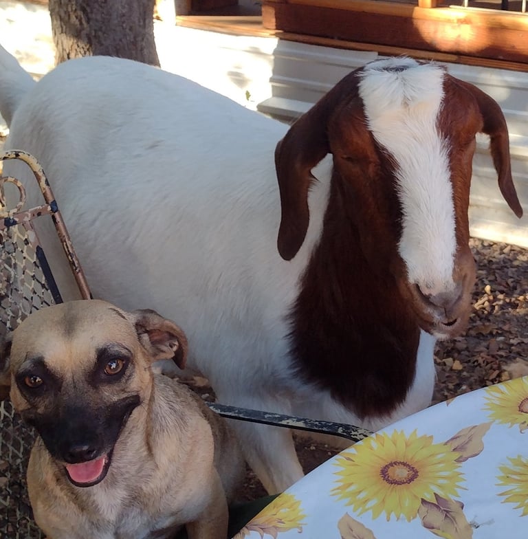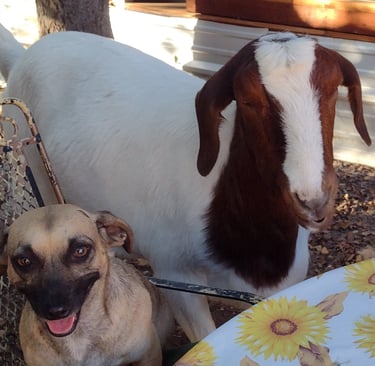Quincy is a 150-pound Boer goat with a big personality. Lucy is a 17-pound pug/wiener dog mix with a heart of gold. Katy is a Lab mix with unbelievable skills. All are rescues. Together, they form one of the most delightful and unexpected animal groups you'll ever meet.