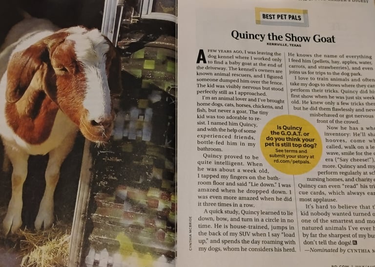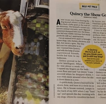 Quincy was featured in the America's Best Pet Pals section of the July/August 2022 Reader's Digest magazine.